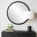 This 32" round mirror features a unique stacked frame construction, boasting a slightly smaller frame layered atop a slightly larger one, creating a dimensional effect. The rounded edges of both frames soften the look, adding a touch of subtle refinement.