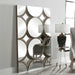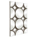 Dimensional aesthetics that feature silver leaf accents with circular beveled mirrors. Group multiple pieces together to create a striking wall accent. May be hung horizontal or vertical.