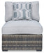This cool, casual outdoor chair will raise the comfort level and visual appeal of your outdoor living space. Made of handwoven wicker in neutral tones of light and dark gray, the armless chair blends beautifully into your lanai or pool and patio area with thick, comfy cushions wrapped in Nuvella® high performance fabric that is stain resistant, fade resistant and easy to clean. This cushioned armless chair can be used on its own or paired with other pieces of the matching sectional to create a space that holds up to Mother Nature and ages gracefully for years of enjoyment.
