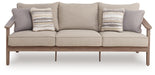 High style, meet sleek durability. This outdoor sofa combines a contemporary silhouette with must-have longevity, so you can bring your eye for design alfresco. It impresses with the refined appeal of woven resin wicker and wood-look aluminum in a chic neutral color. And for easy cleanability and UV resistance, high-performing Nuvella® fabric covers the cushions.