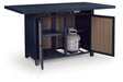Easy-breezy beauty, made to withstand the elements. This outdoor bar table with fire pit makes a serene statement with its soothing shade of blue and contrasting wood-look cabinets. An integrated fire pit in the top adds a perfectly cozy vibe. Crafted with durable materials for added longevity, it's a smartly stylish addition to your outdoor oasis.