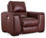 Impressive in scale while keeping an air of refinement, this power recliner stuns with a combination of soft, supple leather and perfectly matched faux leather upholstery in garnet. Sink into the seating area and cater to your comfort with one-touch power reclining and an adjustable headrest. Complete with USB charging, this recliner makes a surefire statement in your contemporary living room.