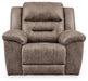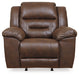 For those who love the cool look of leather but long for the warm feel of fabric, this power rocker recliner delivers both with ease. Its high-performance padded faux leather is remarkably durable and easy to clean, making it just the thing for family spaces. When it’s time to relax, the one-touch power control puts the perfect position at your fingertips. Channel-stitched back cushions provide indulgent lumbar support for maximum seating comfort—not to mention fashion-forward flair.