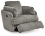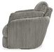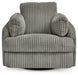 Like a warm hug, this recliner envelops you in comfort with its barrel shape and soft cord upholstery. It reclines, glides, and swivels to cater to your every need. This chair also features posh bolster pillows and cleverly designed storage. Unwind and cuddle up in your new cozy place.