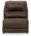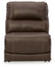 Details | Includes left-arm facing power recliner, power armless recliner, console with storage, wedge, 2 armless chairs and right-arm facing power recliner, "Left-arm" and "right-arm" describe the position of the arm when you face the piece, One-touch power control with adjustable positions, Easy View™ adjustable headrest and zero-draw USB plug-in, Zero-draw technology only consumes power when the USB receptacle is in use, Zero-gravity mechanism allows optimum reclining comfort with infinite reclining positions at the touch of a button, Corner-blocked frame with metal reinforced seat; attached cushions; high-quality foam cushions wrapped in poly fiber, 100% top grain leather covers inside areas such as the back, seat and arm cushions; skillfully matched faux leather covers the remaining areas, Due to its natural origin, real leather can show individual characteristics such as healed scars, growth marks, grain variation and shade variation, Natural variations make each hide unique and do not detract from the wearing qualities of leather, Console with 2 cup holders and hidden storage, Extended ottoman for enhanced comfort, Zero wall design requires minimal space between wall and chair back, Power cord included; UL Listed | |