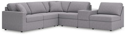 Details | Includes 6 modular pieces: left-arm facing corner chair, 3 armless chairs, wedge and console with storage, "Left-arm" and "right-arm" describe the position of the arm when you face the piece, Modular pieces can float anywhere; sides are finished (with no connectors), Corner-blocked frame, Loose reversible seat and back cushions; high-quality foam cushions wrapped in poly fiber, Throw pillows included; soft polyfill, Polyester upholstery, Next-Gen Nuvella™ is a family-friendly fabric that is soft, easy to clean, stain-resistant and durable; easy-to-remove zippered covers for machine washing, Clean fabric with mild soap and water, let air dry; for stubborn stains, use a solution of 4 oz. bleach to 28 oz. water, Non-skid legs, Console with removable plexiglass top; pull-out drawer for storage, Platform foundation system resists sagging 3x better than spring system after 20,000 testing cycles by providing more even support, Smooth platform foundation maintains tight, wrinkle-free look without dips or sags that can occur over time with sinuous spring foundations | |