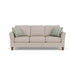 Fit, flared, and artfully paired with traditional style. Libby is a transitional stationary style with clean lines and graceful curves. Its off-the-floor frame is complimented by square tapered legs. This sofa features an elegant roll arm with a detailed welt trim. Two square accent throw pillows are provided. The posh and plush style of Libby fits in with many home décor spaces.