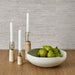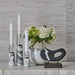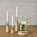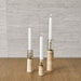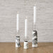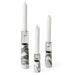 Taper candles find an impressive home in these sculptural forms. Columns of honed Arabescato marble lend substance. Thick optic crystal provides sparkling clarity. Bisected by a steel ring with a finish, these candleholders make a thoughtful arrangement even when unfilled. Set of three staggered heights. Tapers not included. Sizes: S-2x5x2, M-2x8x2, L-3x11x3