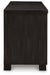 Details | Made with hardwood solids and thick rustic oak veneer, Black finish with rubbed-through edges, Metal bar pulls with rustic texture in a dark pewter-tone finish, 2 cabinets with glass front doors, each with an adjustable shelf, 2 storage drawers, Cutouts for wire management, Minor assembly required, simply lay flat and attach feet | |