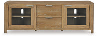 This TV stand's classic yet contemporary good looks are hard to deny. Softly shaped posts with a light oak finish and wire-brushed wood grain texture lend an organic appeal to your entertainment space. Roomy drawers are just the ticket for extra media storage and keeping day-to-day clutter at bay, while the shelf is ideal for fashionable display pieces.