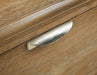 Details | Made with rubberwood solids, oak veneer and MDF substrates, Light oak finish with light wire-brushed wood grain texture, Bin pulls with silvertone finish, 2-door cabinet with glass insert and adjustable shelf, 2 center drawers with fully finished interior, dovetail construction and ball-bearing side glides, Softly shaped posts, Thick cove profiled top, Cutouts for wire management, Minor assembly required | |