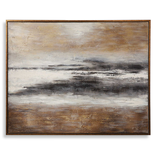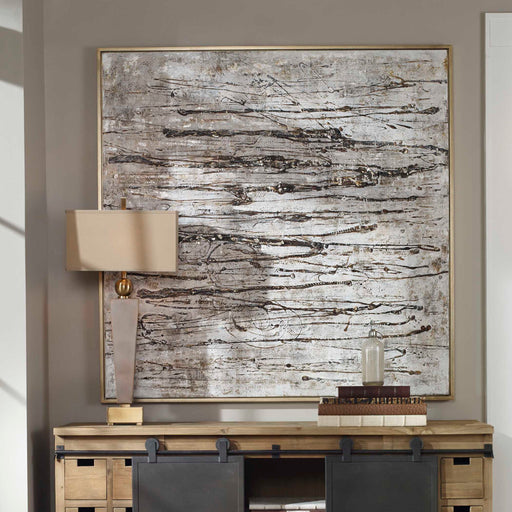 RevelationModern, industrial style emanates from this hand painted abstract on canvas. An array of textured gray, brown, white, and off white brushstrokes ar...