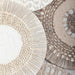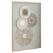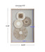 Artfully constructed woven naturals create a unique, global look. Each disk is made of hand cut Mulberry paper and carefully knitted together in a 3-dimensional display, set atop a beige linen backing and showcased in a naturally finished pine shadow box. May be hung horizontal or vertical.