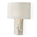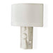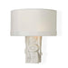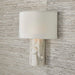 The sculpted petite white marble body is sure to make a big statement in large or small spaces. The semi-circle hardback faux silk shade gently filters the light and is tailored-edged with a 1" self-trim. Engineered to avoid light leaks, the Aesthetic Sconce sits seamlessly against the wall for a warm, clean glow. 2-60 watt max candelabra sockets. Bulbs not included.