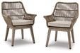 Details Set of 2, All-weather resin wicker furniture with aluminum frame, Nuvella® (solution-dyed polyester) high-performance fabric, All-weather foam cushion core wrapped in soft polyester, Stainless steel hardware, Designed to withstand the harsh elements of the outdoors, Wood look hand-applied paint finish, Clean fabric with mild soap and water, let air dry; for stubborn stains, use a solution of 4 oz. bleach to 28 oz. water, Imported fabric and fill, Assembly required