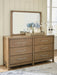 This dresser with mirror sits comfortably at the intersection of modern lodge and farmhouse aesthetics. Your warm and welcoming disposition is reflected in the charming architectural elements and light brown glazed finish. Even with its poise, the piece remains practical. Smooth-gliding drawers tuck away necessities, defining your bedroom with reliable function and style.