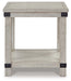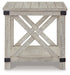 Sporting a distressed whitewash finish, this end table is rustic farmhouse living at its best. Crossbuck styling adds striking flair. Metal industrial brackets incorporate an industrial twist.