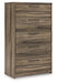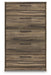 Details Made with engineered wood (MDF/particleboard/plywood) and decorative laminate for the right balance of affordability and durability, Weathered brown finish over replicated oak grain with authentic touch, Decorative laminate replicates natural or man-made material surfaces with consistent color, pattern and texture, Linear pulls with antiqued gunmetal finish, 5 smooth-gliding drawers, Drawer interiors are lined with a faux linen laminate for a clean, finished look, Safety is a top priority, clothing storage units are designed to meet the most current standard for stability, ASTM F 2057 (ASTM International), Drawers extend out to accommodate maximum access to drawer interior while maintaining safety