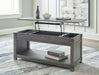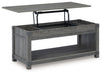 Open the door to modern farmhouse style with this lift-top coffee table. The beautiful woodgrain look and classic crossbuck metal accents are a cool touch, while the lower shelf provides surface space for fashionable home accessories. Sporting a gray replicated wood grain effect, its handy spring-loaded mechanism brings the tabletop closer to you. This versatile table makes it easier than ever to eat, work or play from the comfort of your sofa.