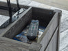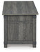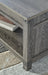 Details | Made of metal and engineered wood, Gray decorative wood grain laminate, Metal crossbuck accents, Lift top design; hidden storage under lid, Fixed lower shelf, Assembly required | |
