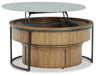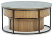 Details | Set includes lift-top coffee table and rolling storage trunk, Made with oak veneer and engineered wood, Light, natural finish, Metal frame with black finish, Coffee table with faux cement melamine top; lift-top mechanism, MEGA-TUFF® melamine surfaces are made of easy-clean melamine which is heat-, scratch-, water- and stain-resistant, Nesting design storage trunk with casters for easy mobility, Assembly required | |