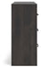 Details | Made with engineered wood (MDF/particleboard/plywood) and decorative laminate for the right balance of affordability and durability, Charcoal finish over replicated oak grain with authentic touch, Decorative laminate replicates natural or man-made material surfaces with consistent color, pattern and texture, Large-scale dark colored handles, 6 smooth-gliding drawers, Drawer interiors are lined with a faux linen laminate for a clean, finished look, Safety is a top priority, clothing storage units are designed to meet the most current standard for stability, ASTM F 2057 (ASTM International), Drawers extend out to accommodate maximum access to drawer interior while maintaining safety, Minor assembly required | |