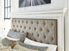 Details | Includes queen upholstered headboard, panel footboard and rails, Made with solid wood, veneers and engineered wood, Distressed whitewash finish, Button tufted fabric upholstery, Nailhead trim, Foundation/box spring required, sold separately, Mattress available, sold separately, Assembly required | |