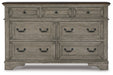 Details | Made with acacia wood, birch and acacia veneers, engineered wood and cast resin components, Two-tone finish; antiqued gray body with a rich, deep walnut brown finish on top, Dark bronze-tone bails and knobs, 7 smooth-gliding drawers with dovetail construction, Framed drawer fronts, Overlay decorative corbels | |