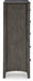 Details | Made with hardwood solids and MDF substrates, Medium gray-brown finish with a blackened wood grain contrast; embossed wood grain texture, Metal bar pulls with matte black finish, Inset drawers, 5 smooth-gliding drawers with fully finished interiors and metal ball-bearing side glides (top drawers felt lined) | |