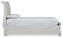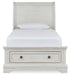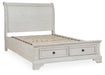 Includes headboard, storage footboard and rails with roll slats, Made with select oak veneer, engineered wood, solid wood components and cast resin components, Antiqued white finish with grain texture, 2 smooth-gliding drawers with dovetail construction and metal ball bearing side glides, Dark bronze-tone knobs, Bed does not require additional foundation/box spring; accommodates most zero clearance adjustable bases with the addition of a bunkie board, Mattress available, sold separately , Assembly required |