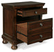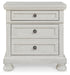 Elegant, timeless furnishings take your bedroom to the next level. Nothing does that better than this nightstand. The antiqued white finish with a wonderful grain texture radiates sophistication, while the dark bronze-tone hardware adds an ornate touch. A hidden pull-out tray behind the bottom drawer puts your small valuables out of sight. Felt finishing in the top drawer and a hidden pull-out tray rounds out the piece for the ultimate tasteful bedroom.