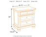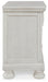 Details | Made with select oak veneer, engineered wood, solid wood components and cast resin components, Antiqued white finish with grain texture, Dark bronze-toned knobs, 2 smooth-gliding drawers with dovetail construction and ball bearing side glides (pull-out tray and top drawer felt lined) | |