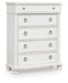 Details Made with hardwood solids, veneers and MDF substrates, Rubbed antiqued white finish, Metal hardware with pewter-tone finish, 5 smooth-gliding drawers with fully finished interiors, French/English dovetail construction and heavy-duty ball-bearing side glides, Top drawer felt lined