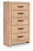 This chest of drawers brings a touch of modern farmhouse charm to your home. Its light oak finish and clean lines have a fresh, airy feel, effortlessly creating an inviting atmosphere for a restful night’s sleep. Five spacious drawers with large black handles provide plenty of storage for all your nighttime essentials.