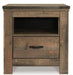 Details | Made of engineered wood (MDF/particleboard) and decorative laminate, Warm rustic plank finish over replicated oak grain with authentic touch, Antiqued bronze-tone hardware, 1 storage cubby, 1 smooth-operating drawer, Nailhead accents, 2 slim-profile USB charging stations, Power cord included; UL Listed, Assembly required | |