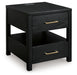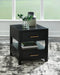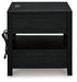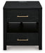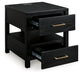 Details | Made with hardwood solids, mindi veneer and MDF substrate, Black finish with wood grain texture, 2 smooth-gliding drawers, Drawer pulls with goldtone finish, Open cubby, 110V power supply with USB-A and USB-C charging ports, Power cord included; UL Listed | |