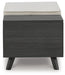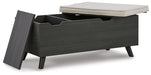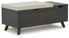 Details | Made with engineered wood and decorative laminate, Replicated blackened wood finish with grayed textural grain, 2 hidden storage compartments, Linen-look polyester foam cushion, Removable seat cushion and tops, Tapered legs, Assembly required | |